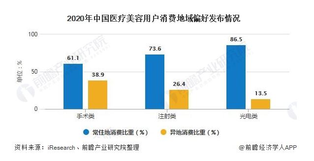 根據iResearch公佈的調研數據顯示,2020年中國醫美用戶手術類消費選擇在常住地進行的比重為61.1%,注射類消費選擇在常住地進行的比重為73.6%。從中國醫療美容用戶的地域偏好來看,有錢有能力出國醫美消費的,最受我國歡迎的是韓國、日本。