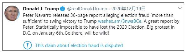 現在,特朗普號召粉絲們在最後關口發動最後一戰,準備擊潰拜登。路透社消息,特朗普已經3度發推,號召支持者們行動起來參加集會,「不能讓歷史上最大的騙局成功。」「永不放棄,我們1月6日華盛頓見,那裏將非常瘋狂!」