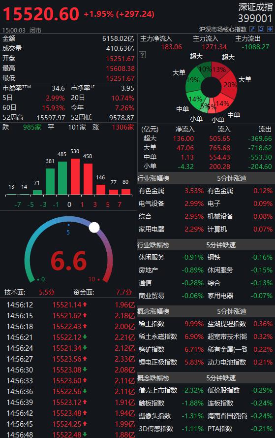 21日,各大指數震盪走高,創業板指和上證都創出短期新高。盤面上,煤炭開採加工、有色冶煉加工、醫療器械服務、食品加工製造、新材料和飲料製造位於行業板塊漲幅榜前,漲幅均大於2%。稀土永磁、稀缺資源、煤炭概念、基因測序和小金屬概念的漲幅在概念板塊居前,漲幅均大於2%。跌幅榜上,只有牧業管理和註冊制次新股兩個板塊的跌幅大於1%。兩市個股漲多跌少,漲幅大於7%的個股159只,其中漲停102只,跌幅大於7%的個股19只。兩市合計成交額10857億元,市場賺錢效應較好。截至收盤,上證指數漲1.07%,報3621.26點,深證成指漲1.95%,報15520.60點,創業板指漲2.46%,報3283.72點。