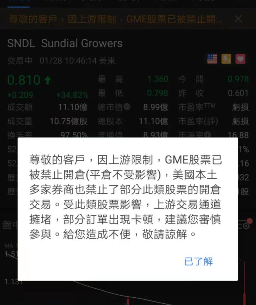 另外,富途控股稱,因上遊限制,GME、AMC股票已被禁止開倉(平倉不受影響),美國本土多家券商也禁止了部分此類股票的開倉交易。受此類股票影響,上遊交易通道擁堵,部分訂單出現卡頓,建議審慎參與。