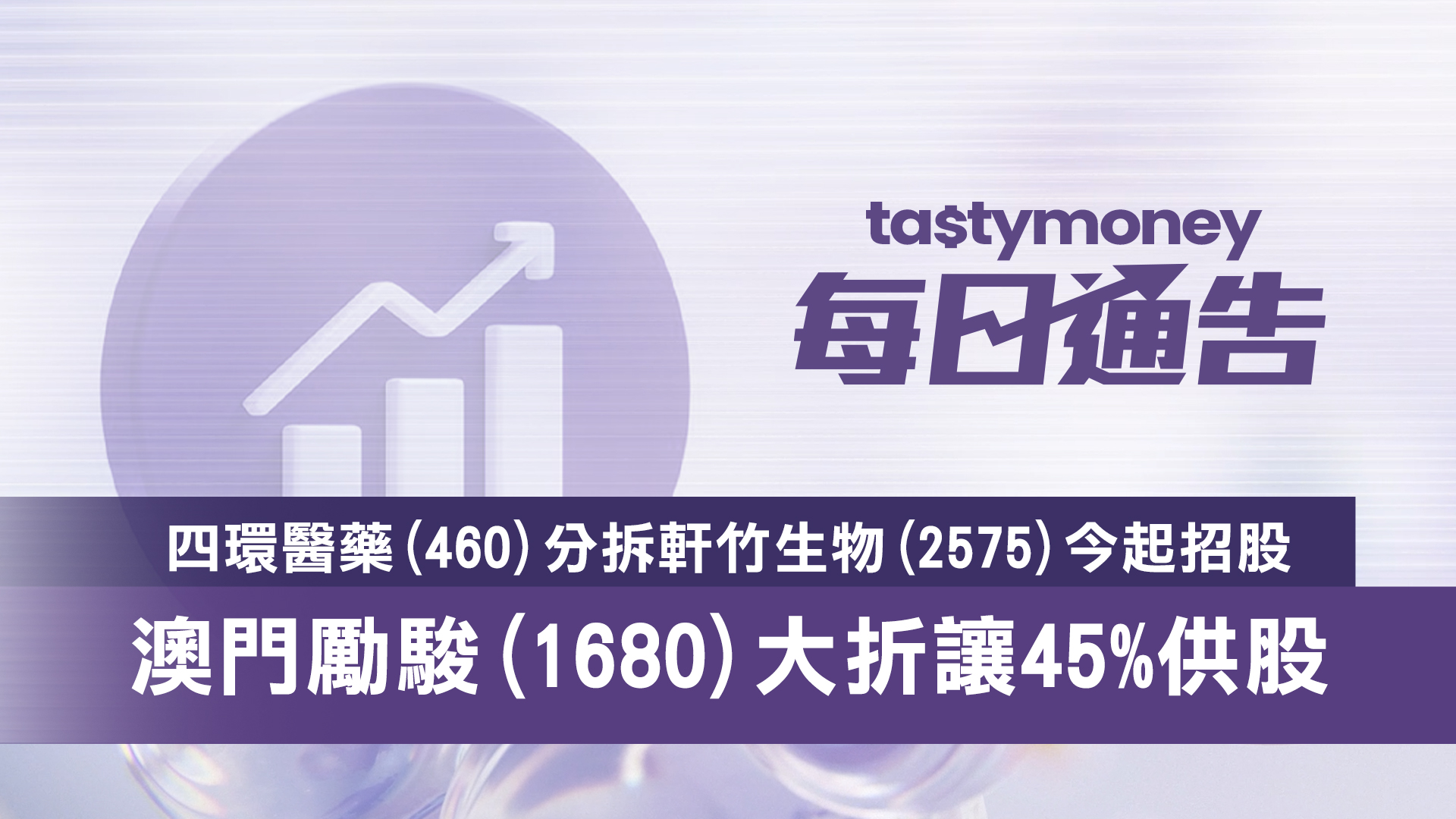 由四環醫藥(0460.HK)分拆的軒竹生物(2575.HK)一手500股,發售價11.6元。一手入場費5858.5元,計劃發行6733.4萬股H股,10%於香港作公開發售,計劃集資7.811億。10月10日截止認購,預計15日上市,中金公司為獨家保薦人。