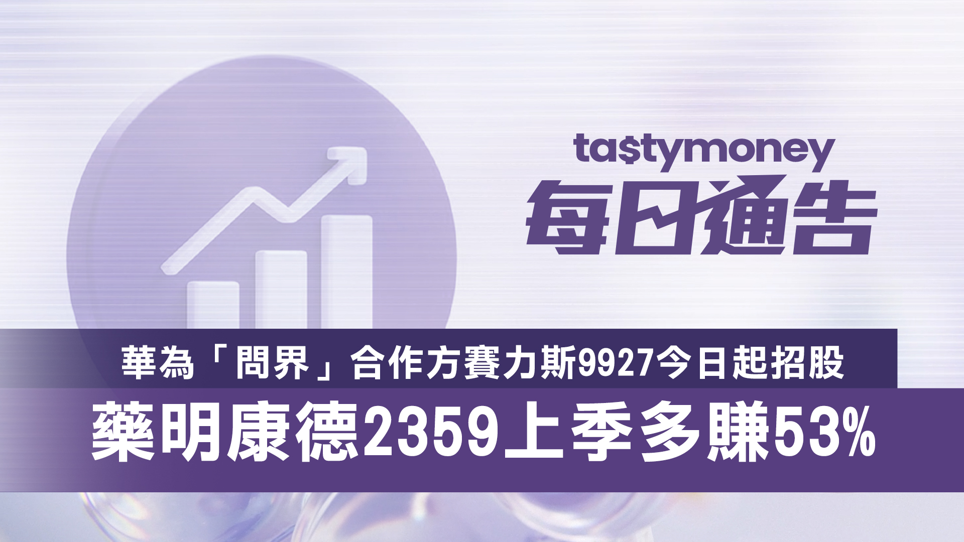 市場一直關注、與華為合作推出「問界」電動車的賽力斯(9927.HK)今日(27日)起公開招股,發售價每股131.5元,一手100股,一手入場費13,282.62元。10月31日截止招股,預計11月5日上市。