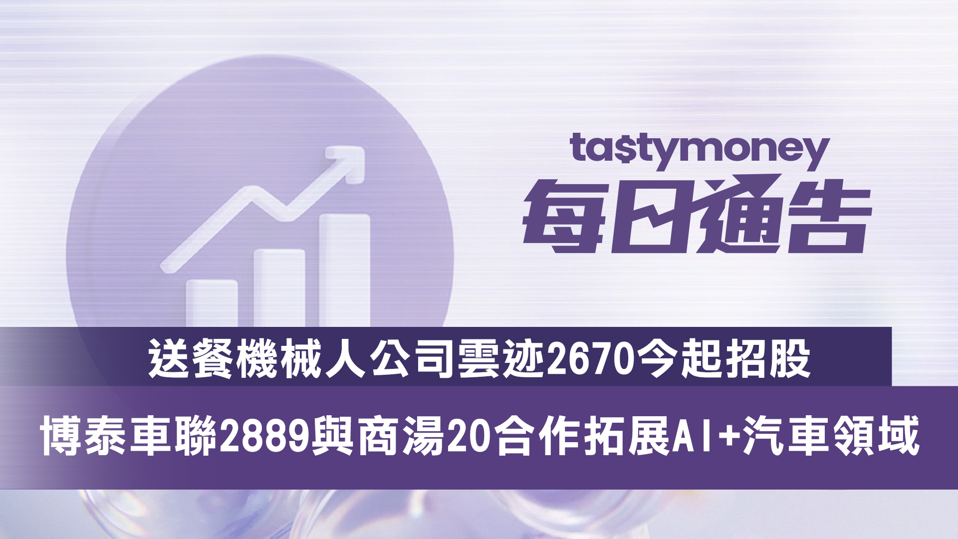 【每日通告】送餐機械人公司雲迹2670今起招股,博泰車聯2889與商湯20合作拓展AI+汽車領域