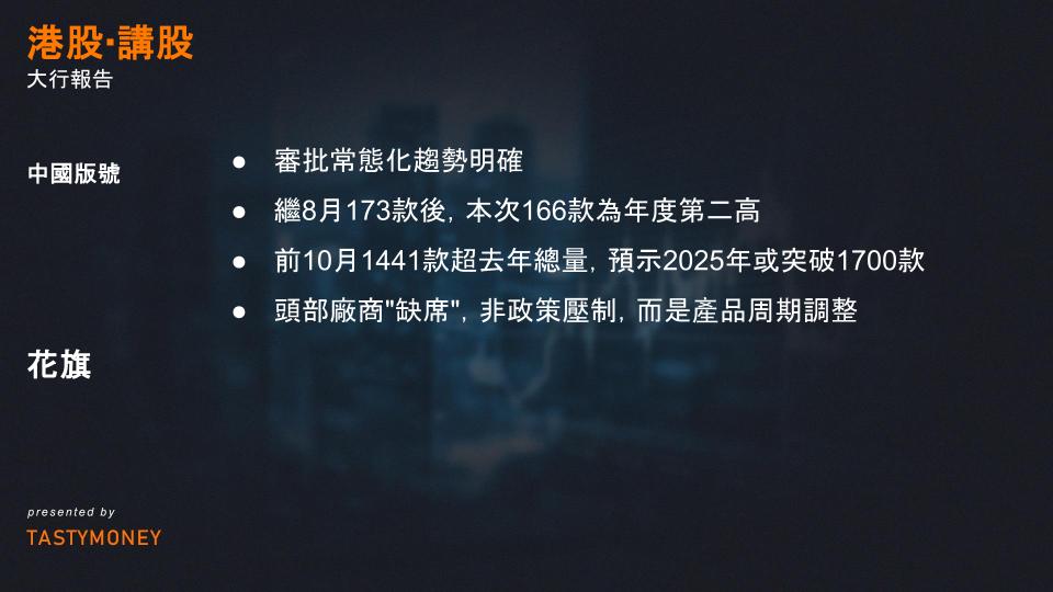 - 年度總量突破:前10月1441款超去年總量,預示2025年總審批量或突破1700款,政策面持續寬鬆。