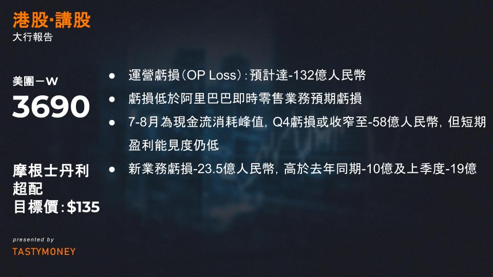 - 運營虧損(OP Loss):預計達-132億人民幣,主要由即時配送業務(On-demand Delivery)虧損-186億人民幣導致。