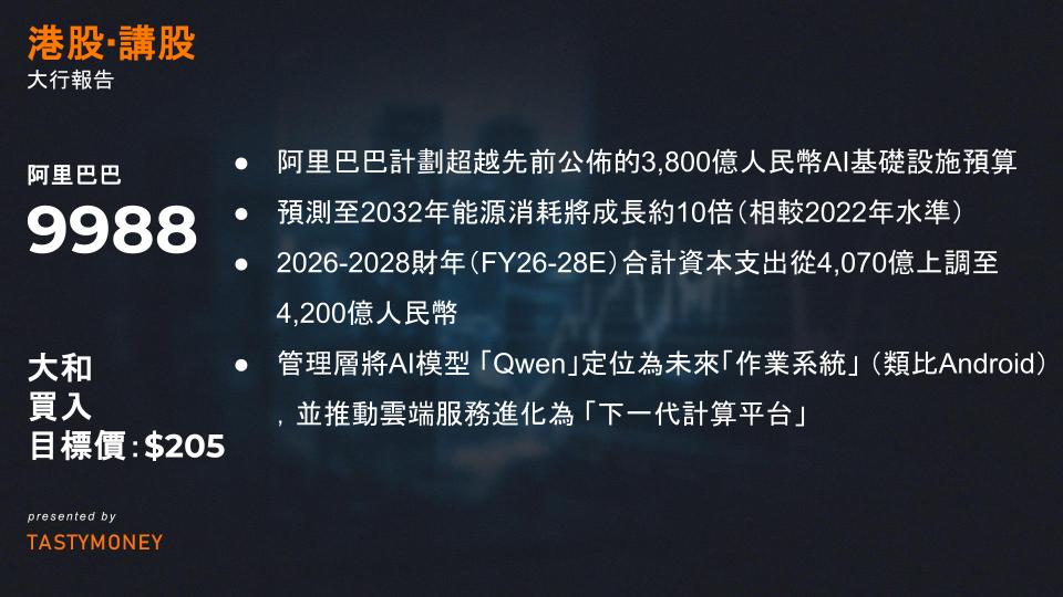 - 雲業務拐點確認:透過杭州「飛天大會」觀察,阿里雲對外部客戶的變現能力(雲收入)及與國內電商協同效應提升,強化長期增長能見度。