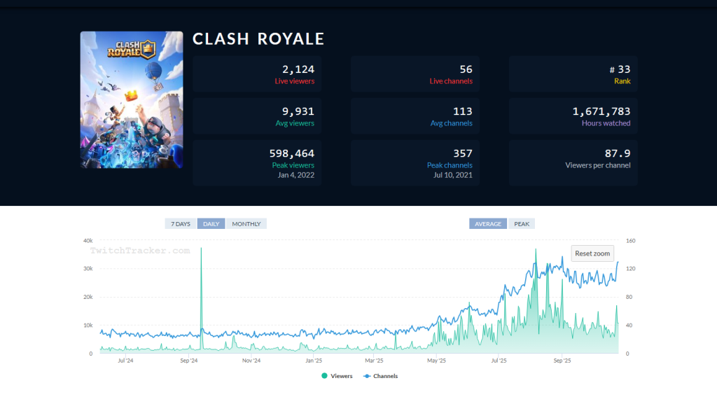 2025年4月,Twitch知名主播Jynxzi(擁有800萬粉絲)開始轉播《皇室戰爭》,其高能量的互動風格與職業玩家連線對戰(如Tribe Gaming的BossCR)引發關注。據數據顯示,他首次直播CR即吸引平均1.78萬觀眾,觀看時長較2024年翻倍。此後,Twitch平台CR直播時數暴增,其他主播紛紛跟風,帶動大量新玩家入場。