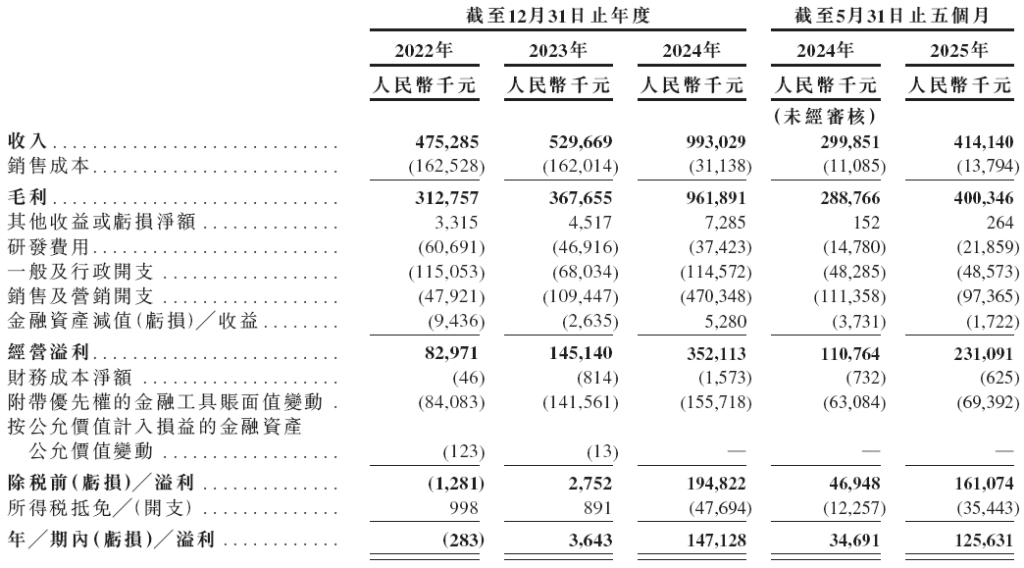 招股書顯示,在過去的2022年、2023年、2024年和2025年前五個月,量化派的營業收入分別為人民幣4.75億、5.30億、9.93億和4.14億元,相應的淨利分別為人民幣-28.3萬、364.3萬、1.47億和1.26億元,相應的經調整淨利分別為人民幣1.26億、1.48億、3.63億元和2.12億元。
