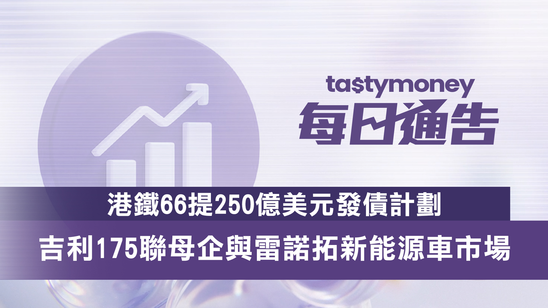 港鐵公司(0066.HK)計劃發行250億美元債券、折合約1,950億港元。港鐵公司宣布已向港交所提交發債計劃,安排行是滙豐銀行。債券可採用多種貨幣計值,以及不同形式發行,年期最少一個月,僅向專業投資者發行。所得資金用於一般公司用途。