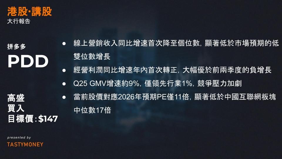 大行報告,高盛: PDD拼多多線上營銷收入同比增速首次降至個位數–20251117
