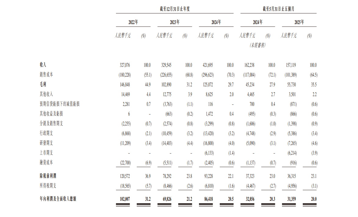 業績方面,22至24年收入分別為3.27億元(人民幣,下同)、3.29億元、4.21億元,按年升28%,期內利潤8641.8萬元,升23.8%。25年首五個月收入為1.57億元,純利方面,22至24年經調整純利分別為1.02 億元、6,982萬元、9,255萬元,25年首五個月經調整純利為3,757萬元。