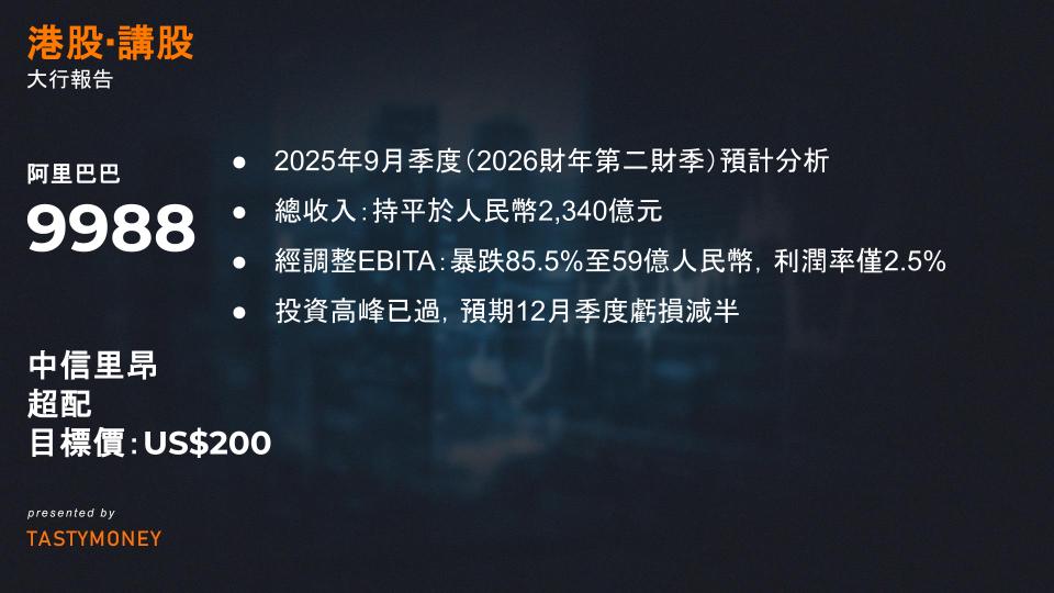 | 利潤 | 經調整EBITA跌79%至90億人民幣 | 快商務投資侵蝕利潤(約370億),但淘寶天貓本體利潤仍低個位數增長 |