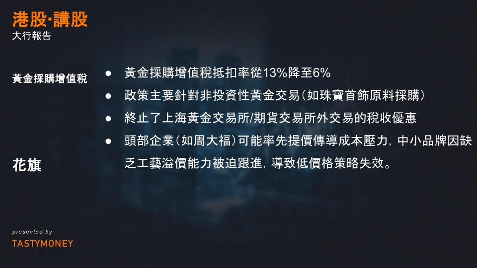 - 政策意圖未明:可能旨在抑制黃金條/幣投資需求,而非珠寶消費,後續細則需重點關注;
