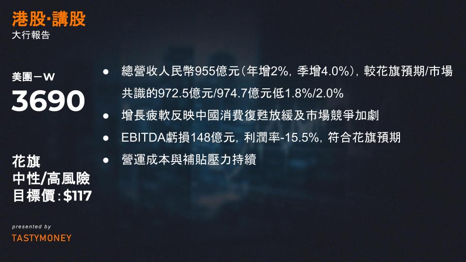 - 收入280億元,同比增長16%,經營虧損13億元,優於預期(主要來自社區團購減虧加速及Keeta在中國香港地區的超預期減虧)。