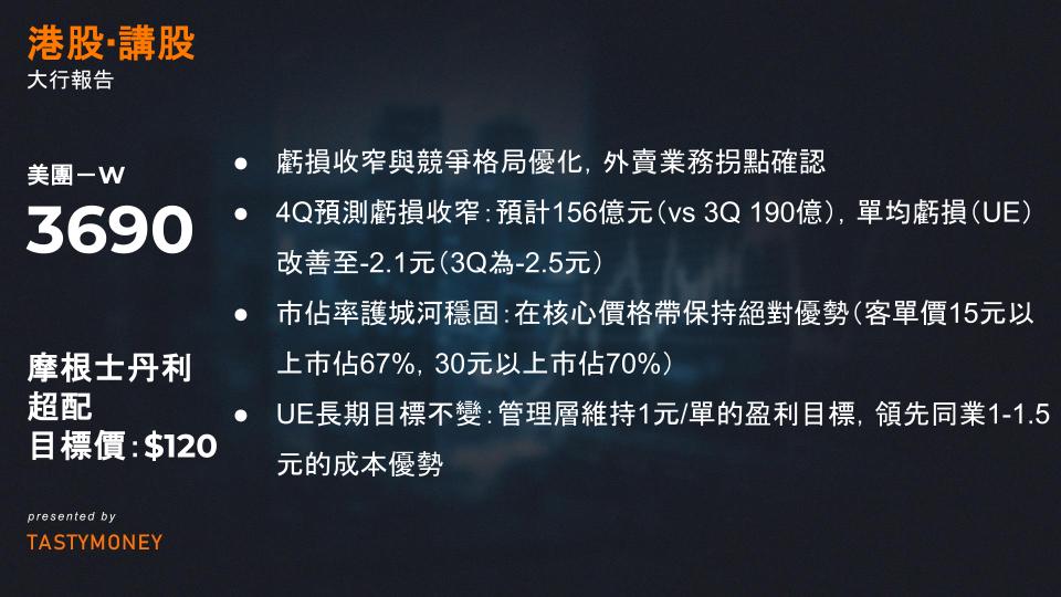 新業務營收年增15.9%至280億元(略低於花旗預估的282億元),含國際擴張(如巴西業務Keeta)及到店服務,展現逆勢韌性。 - 虧損收斂: