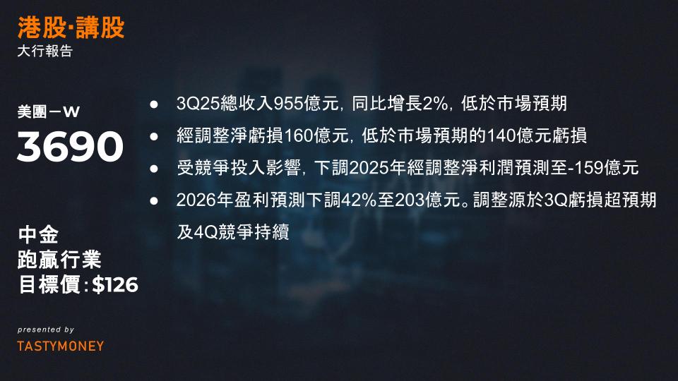 - 2026年盈利預測下調42%至203億元。調整源於3Q虧損超預期及4Q競爭持續。