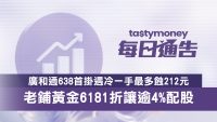 【每日通告】廣和通638首掛遇冷一手最多蝕212元,老鋪黃金6181折讓逾4%配股