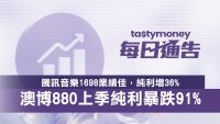 【每日通告】騰訊音樂1698業績佳,純利增36%,澳博880上季純利暴跌91%